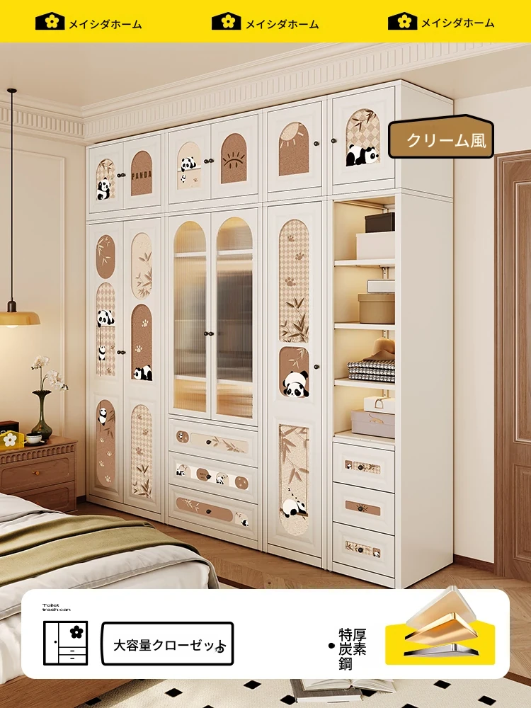 美世达キッズルーム用クリーム風カートゥーンパンダクローゼット - 耐久性カーボンスチール製、ガラス扉の衣類収納キャビネットで、お子様の部屋を可愛く彩ります!