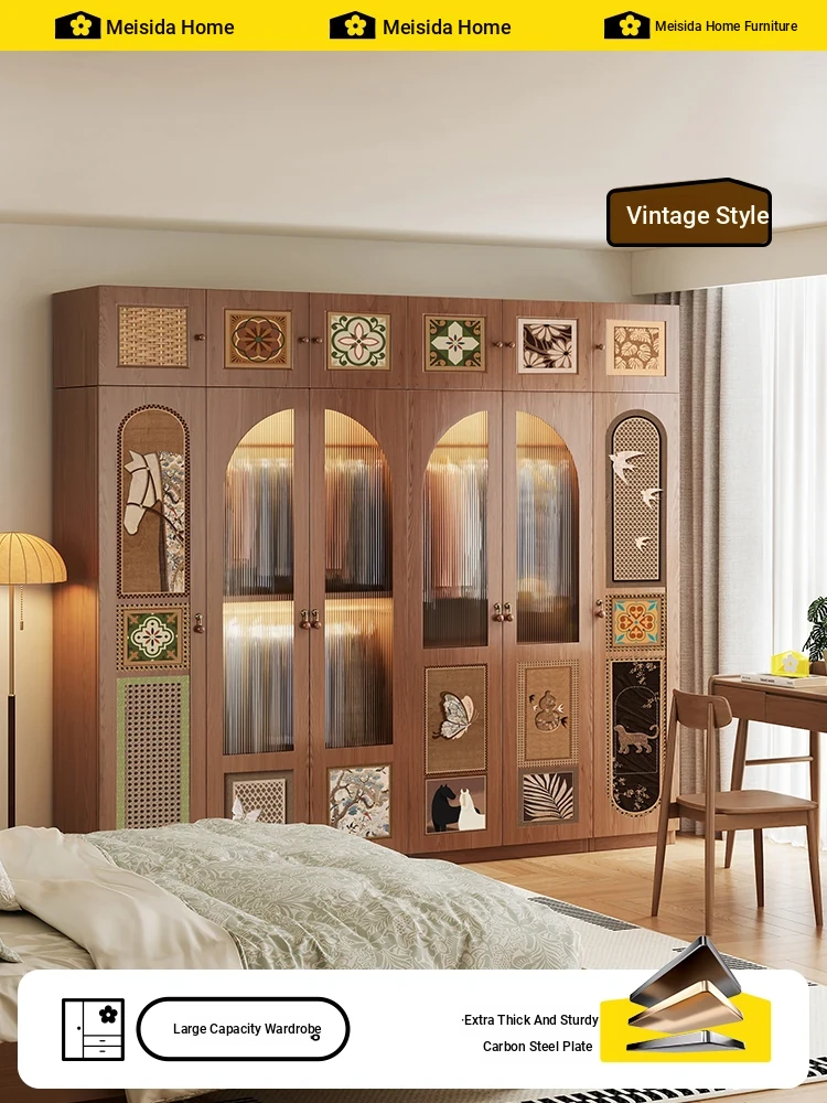 Meisida Vintage-Style Wooden Grain Wardrobe - Sturdy Steel Storage Cabinet for Home Bedrooms, Stylish Metal Closet with Glass Doors for Organizing Clothes and Accessories