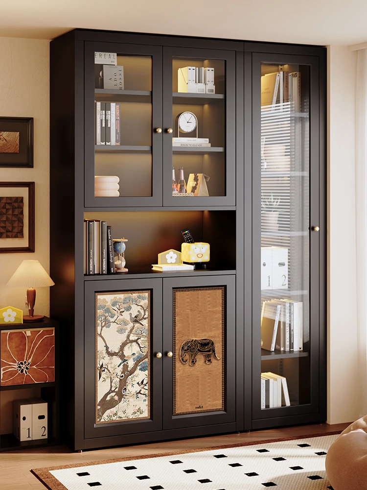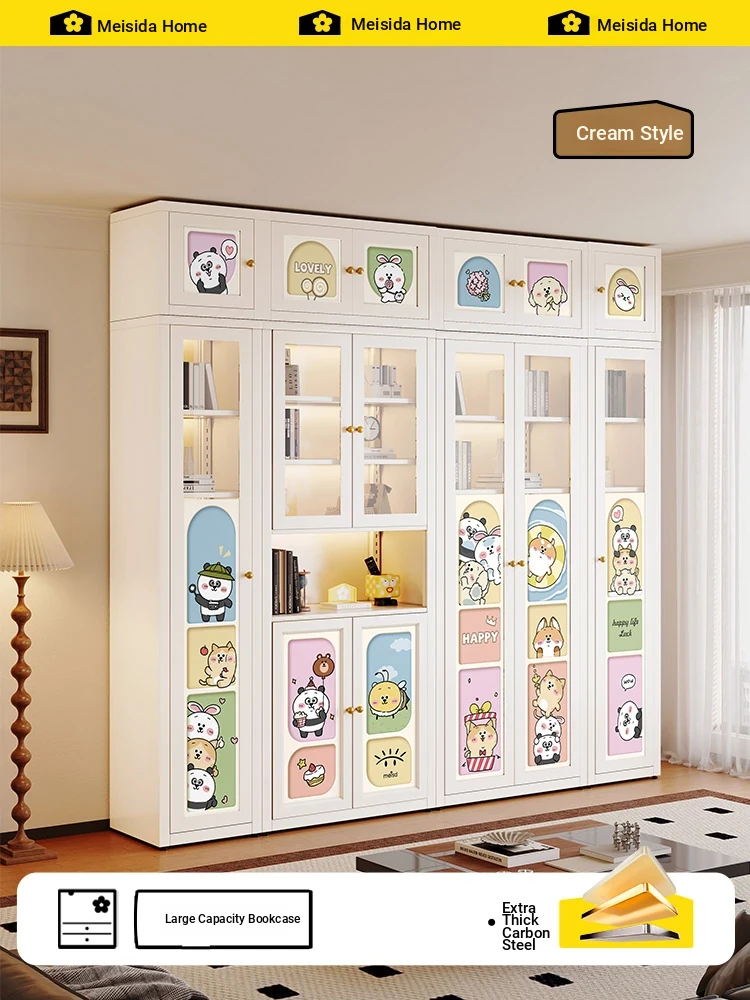 Meista Creamy-Style Bookcase with Glass Doors - Cartoon Iron Art Design for Home Office, Carbon Steel Dustproof Bookshelf for a Stylish Living Room
