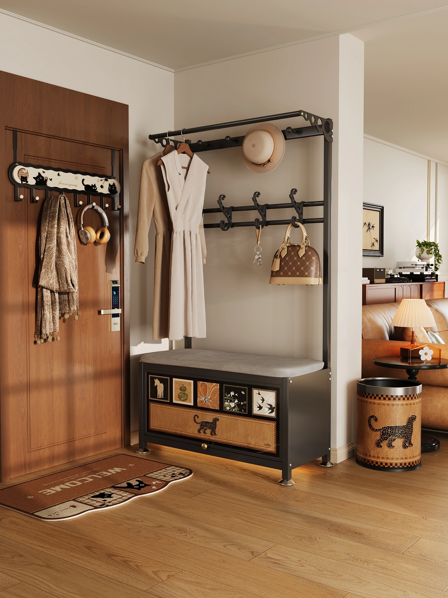 Vintage Style Floor-Mounted Clothes Rack - Elegant Leather Storage Box & Coat Hanger for Bedroom - The Ultimate Clothing Organizer
