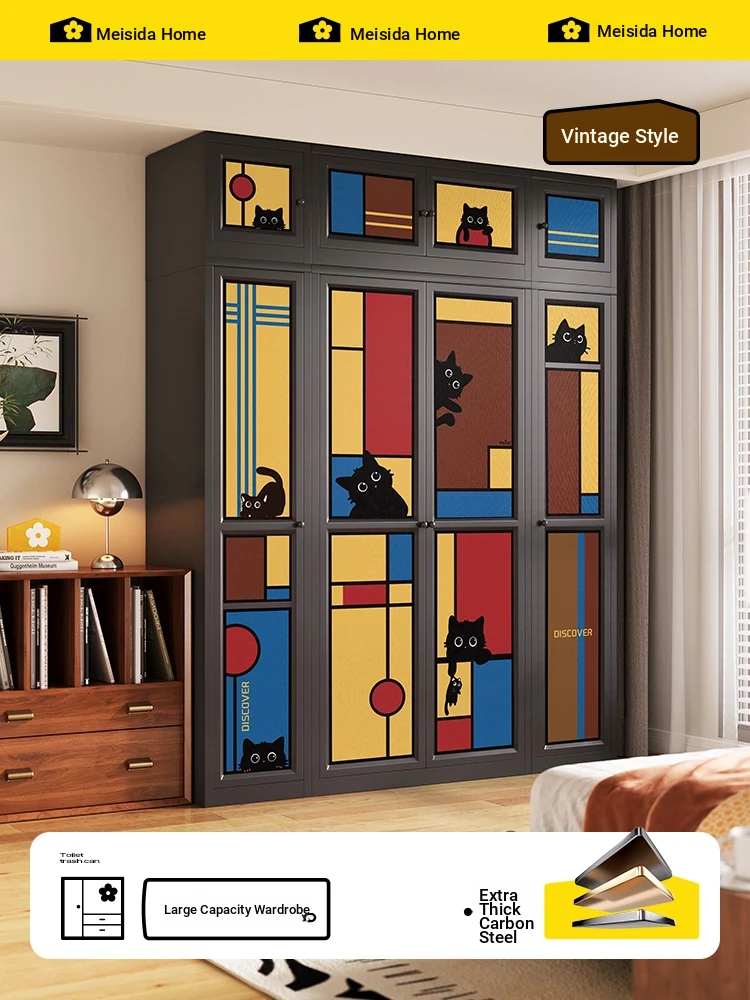 Meisida Cat-Themed Metal Wardrobe for Kids - Eco-Friendly Stainless Carbon Steel Storage Cabinet, Stylish Iron Closet for Small Spaces, Formaldehyde-Free Design