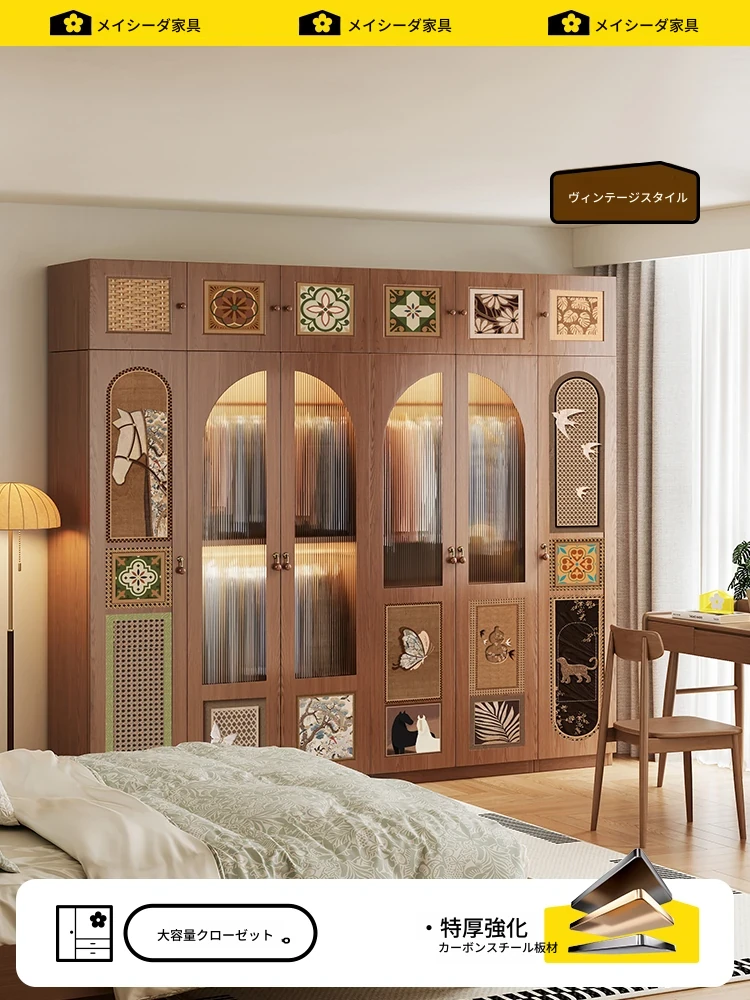 美世达アンティーク風木目大衣柜|スチール製コンビネーション収納キャビネット|家庭用寝室金属収納ガラスクローゼット|スタイリッシュで耐久性抜群!収納力抜群でお部屋をスッキリ整理!