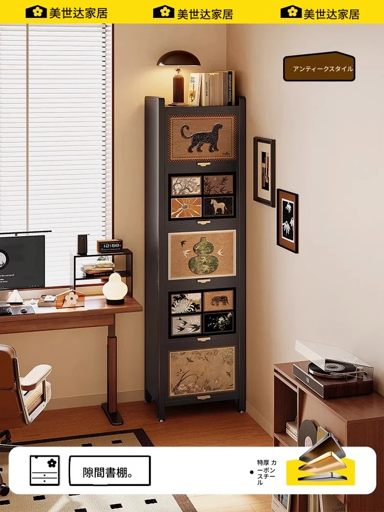 美世达のスタイリッシュなカーボンスチール製フロアシェルフ、ステンレスストレージキャビネット一体型で、壁に寄り添うアンティーク風収納書棚。おしゃれで実用的な収納空間を演出します!