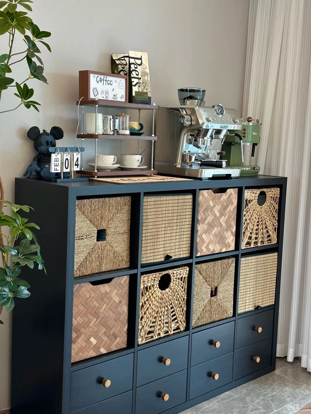 美世达のアンティーク風ステンレス製スリムカフェキャビネット - 壁付けで小さなお部屋にもピッタリ!コーヒーメーカーを置くのに最適なアイロン製ハイキャビネット。おしゃれなインテリアを演出します!