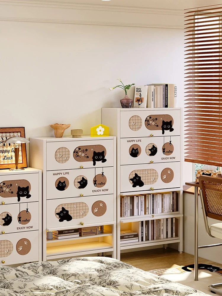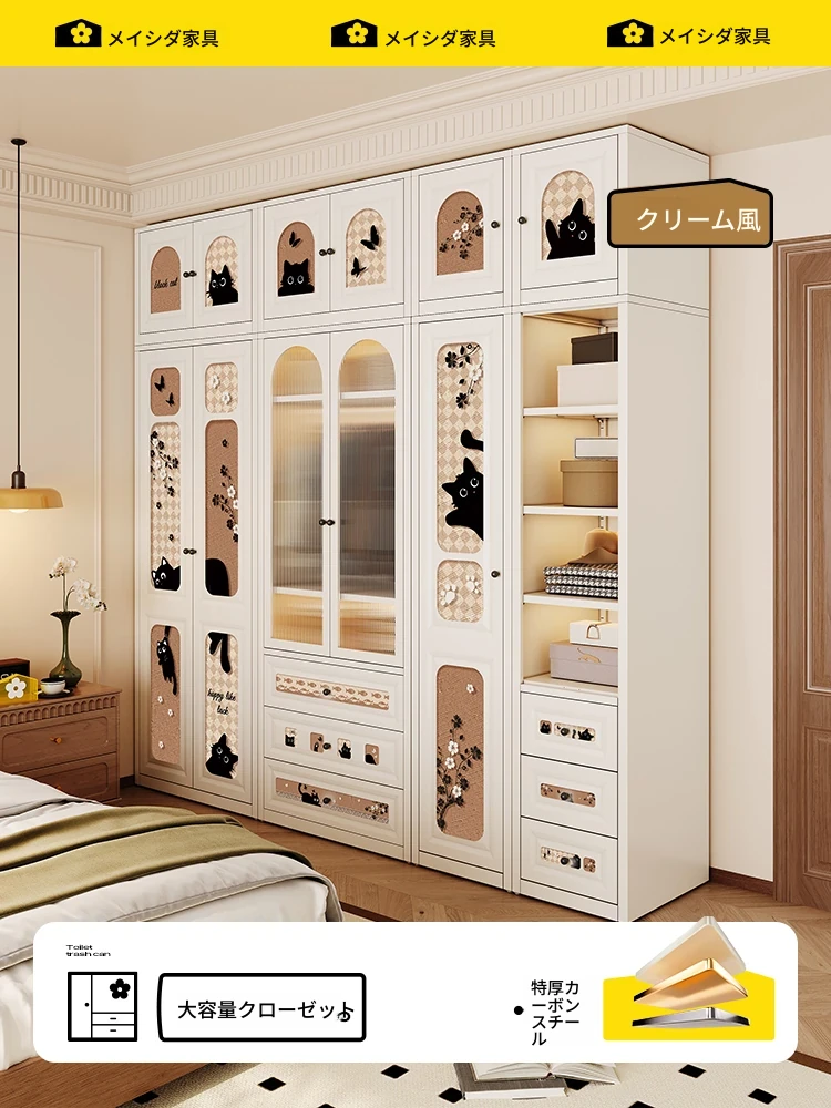 メイシーダ カートゥーンキャット スチールクローゼット コンビネーション 家庭用 寝室用 引き出し付き クリーム風 メタル収納キャビネット