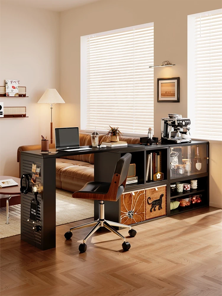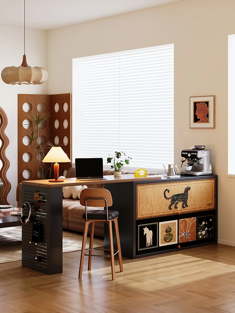 美世达のアンティークスタイルカーボンスチール製玄関キャビネット - 高級感漂うレトロなリビング用パーティションキャビネット、アイアン&レザーの伸縮式バー台テーブル!魅力的なデザインでおしゃれな空間を演出!