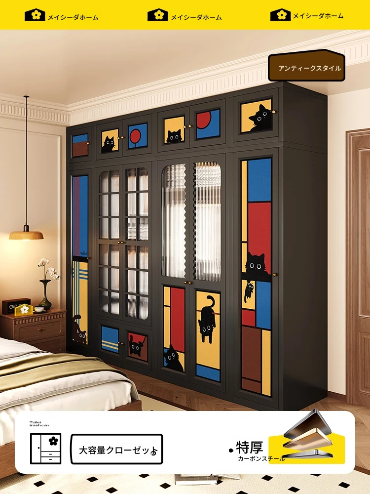 美世达カートゥーン猫デザインの大容量クローゼット!ガラス扉&カーボンスチール製で、主寝室にぴったりなアートなアイアン収納キャビネット。おしゃれで実用的な収納を実現!