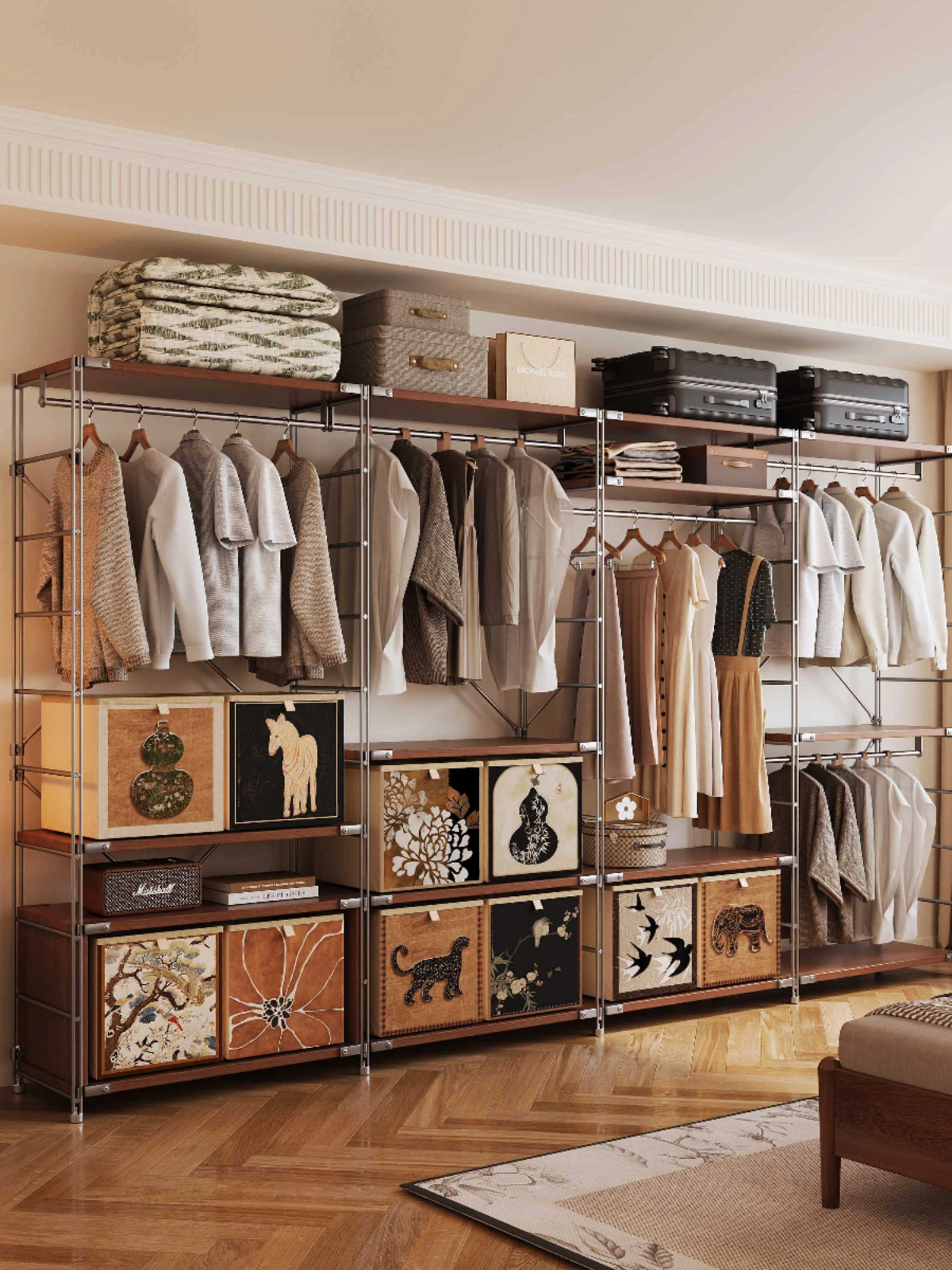 美世达クリーム風2025年の大ヒット衣類収納!家庭用寝室に最適なステンレススチール製フレンチスタイルの金属衣装ケース、皮革コートも美しく収納できます。おしゃれで機能的な収納を手に入れましょう!
